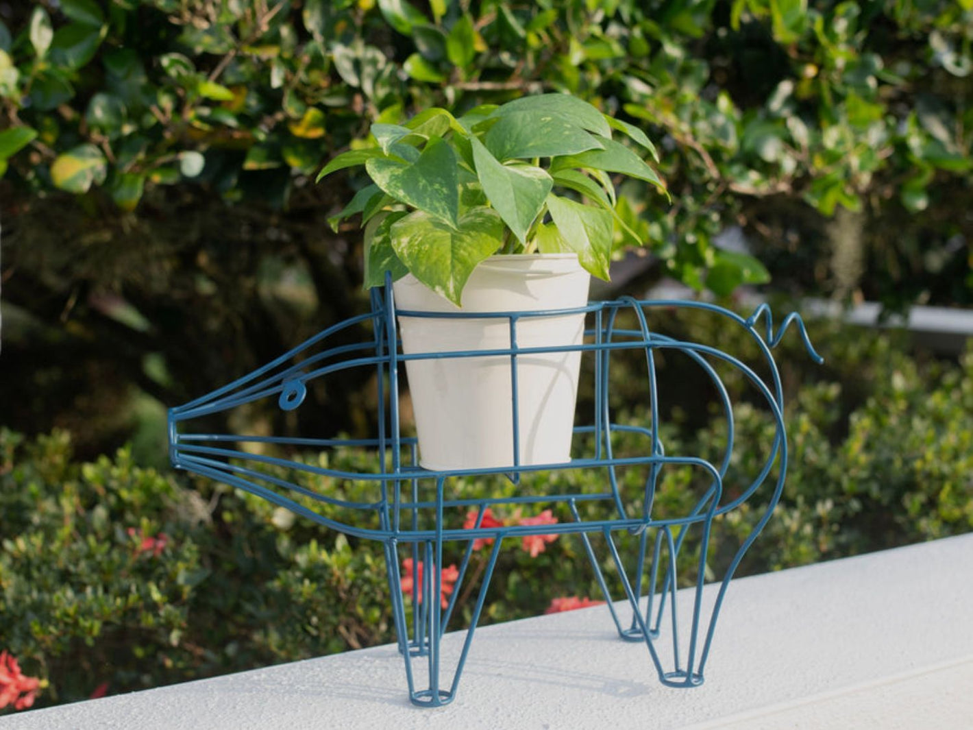 Blue Metal Pig-Shaped Plant Stand with Pot